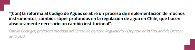 La abogada cree que con “la reforma al Código de Aguas se abre un proceso de implementación de muchos instrumentos, cambios súper profundos en la regulación de agua en Chile, que hacen absolutamente necesario un cambio institucional (…) El agua es tan multifuncional y compleja de administrar (más aún cuando es escasa), que se requiere un cambio institucional mucho más profundo que un Comité Interministerial”.