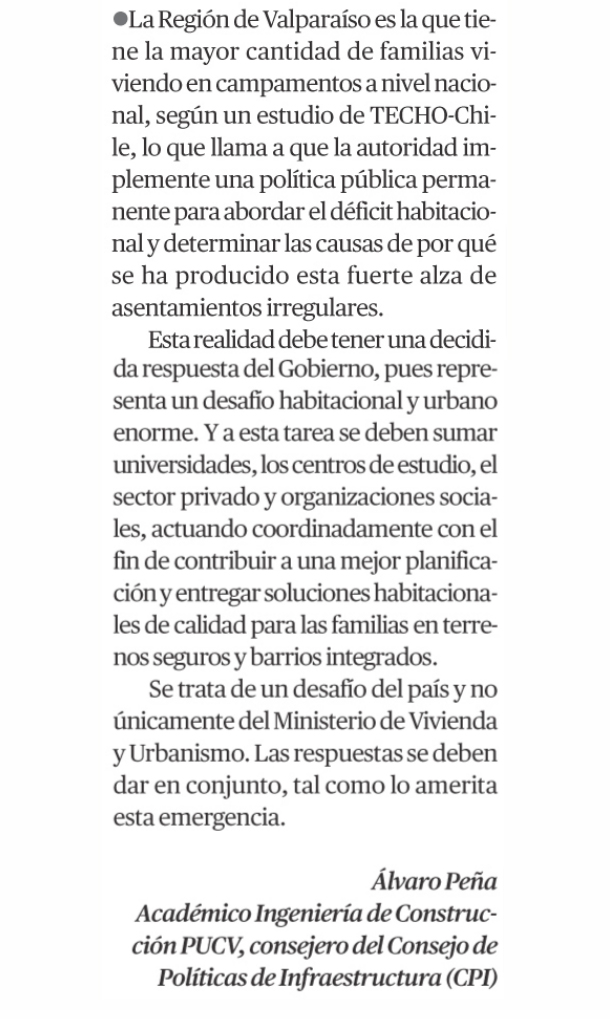 EL MERCURIO DE VALPARAÍSO – Se trata de un desafío país y no únicamente del Ministerio de Vivienda. Las respuestas se deben dar en conjunto, tal como amerita esta emergencia.