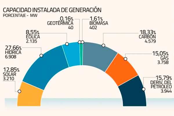 De ese universo, 6.839,4 MW, equivalentes a un 53,2%, corresponden a capacidad hidroeléctrica; un 25,3% solar; 18,1% eólica y un 3,4% a geotermia y biomasa.