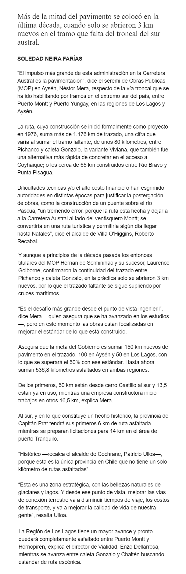 EL MERCURIO – Obras de la vía troncal de la conectividad entre Los Lagos y Aysén se acercan a la mitad de su trazado de 1.136 km. En la última década se pavimentaron 240,8 km