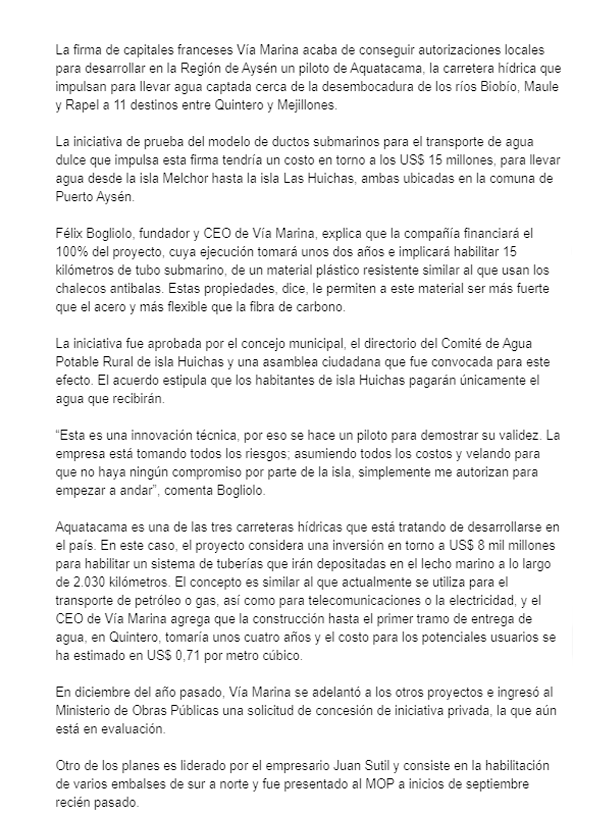 Carretera hídrica Aquatacama realizará piloto de US$ 15 millones