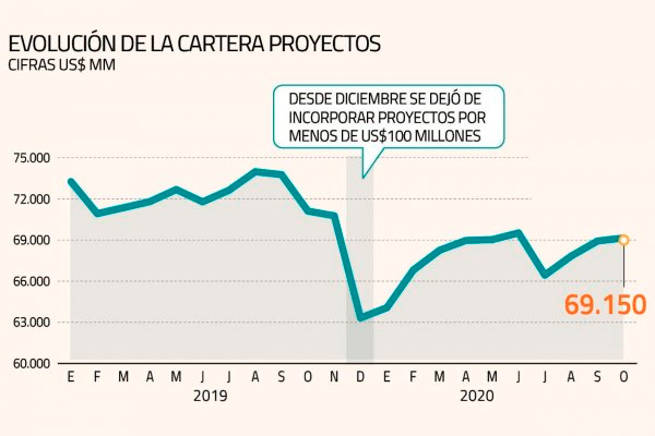 Así se desprende del reporte mensual que emite la oficina de Gestión de Proyectos Sustentables (GPS) al evidenciar que el monto total en el décimo mes del año alcanzó a US$ 69.150 millones. Si bien ello significa un leve crecimiento de 0,3% respecto al catastro de septiembre, el movimiento se origina por la “reincorporación” de una iniciativa antigua a la que se le dejó de hacer seguimiento meses atrás ante el cese de entrega de información por parte del titular del proyecto.