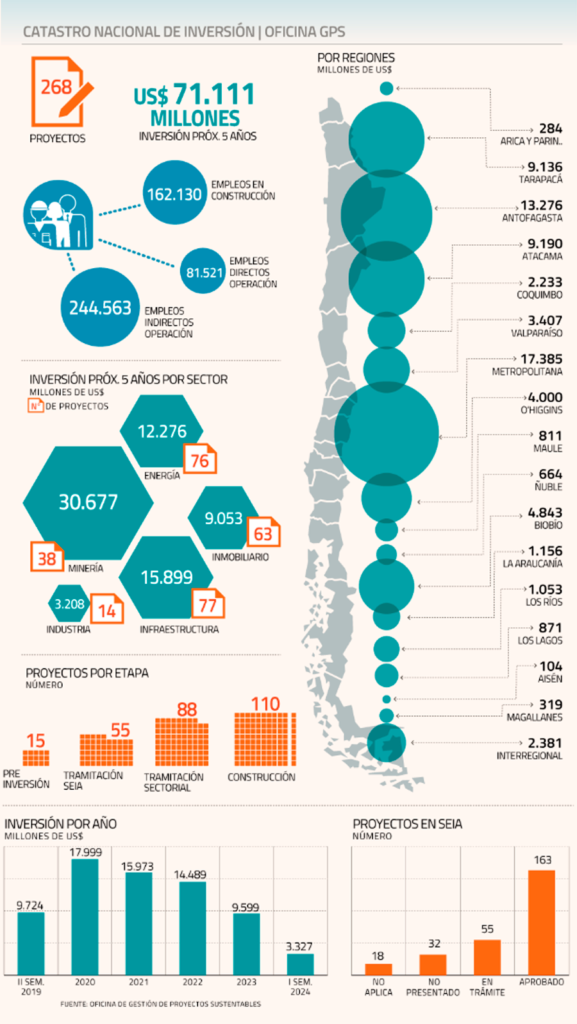 De acuerdo con el reporte actualizado al cierre de octubre, la Oficina de Gestión de Proyectos (GPS) del Ministerio de Economía contabiliza 268 iniciativas por un total de US$ 71.111 millones, de las cuales hay algunas en etapa de construcción como otras en fase de tramitación desde el segundo semestre de este año hasta el primer semestre de 2024.
