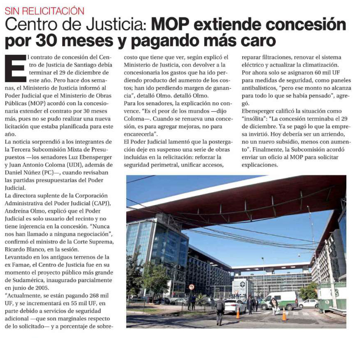 LA SEGUNDA – Hace dos semanas, el Ministerio de Justicia informó al Poder Judicial que el Ministerio de Obras Públicas acordó con la concesionaria extender el contrato por 30 meses más, pues no se pudo realizar una nueva licitación que estaba planificada para este año