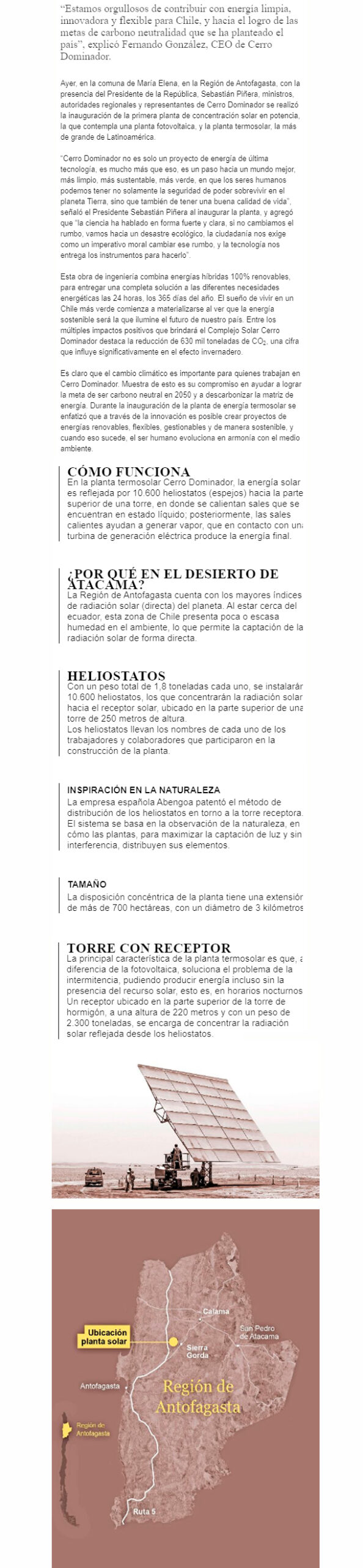 EL MERCURIO – Ayer, en la comuna de María Elena, en la Región de Antofagasta, con la presencia del Presidente de la República, ministros, autoridades regionales y representantes del Cerro Dominador se realizó la inauguración de la primera planta de concentración solar en potencia.