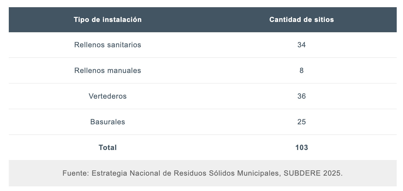 Pese a estos estándares, el sistema enfrenta una presión cada vez mayor. Según el diagnóstico nacional de SUBDERE, en Chile operan 103 sitios de disposición final, pero solo 34 corresponden a rellenos sanitarios, es decir, a instalaciones con mayor estándar ambiental.