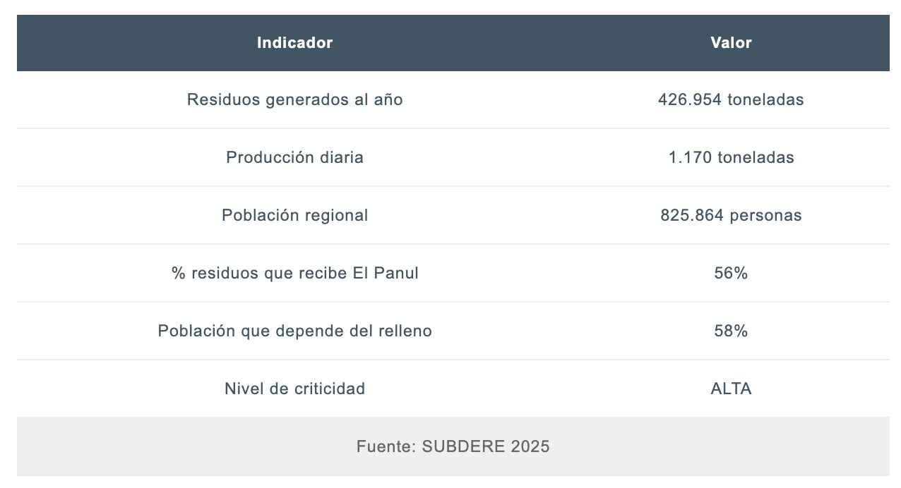 A pesar de ese límite, el recinto continúa funcionando para sostener la demanda regional. La magnitud del problema se entiende al observar que la región genera 426.954 toneladas de residuos al año, lo que equivale a más de 1.170 toneladas diarias. De ese volumen, más de la mitad se deposita en El Panul, transformándolo en el pilar del sistema de disposición final.