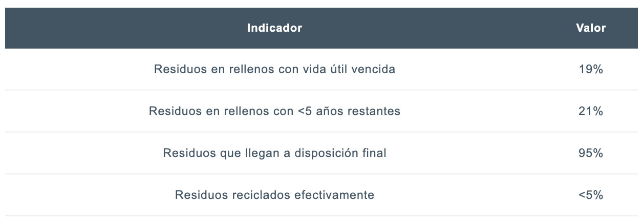 A nivel nacional, el 19 % de los residuos domiciliarios se deposita en rellenos sanitarios cuya vida útil ya se encuentra vencida. Esto implica que una parte importante de la basura del país continúa llegando a instalaciones que han superado el límite técnico para el cual fueron diseñadas.