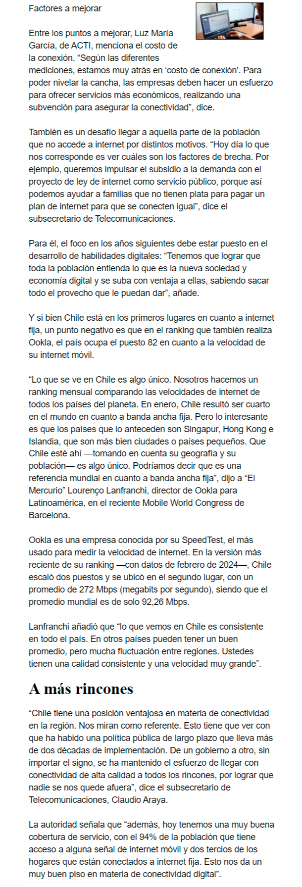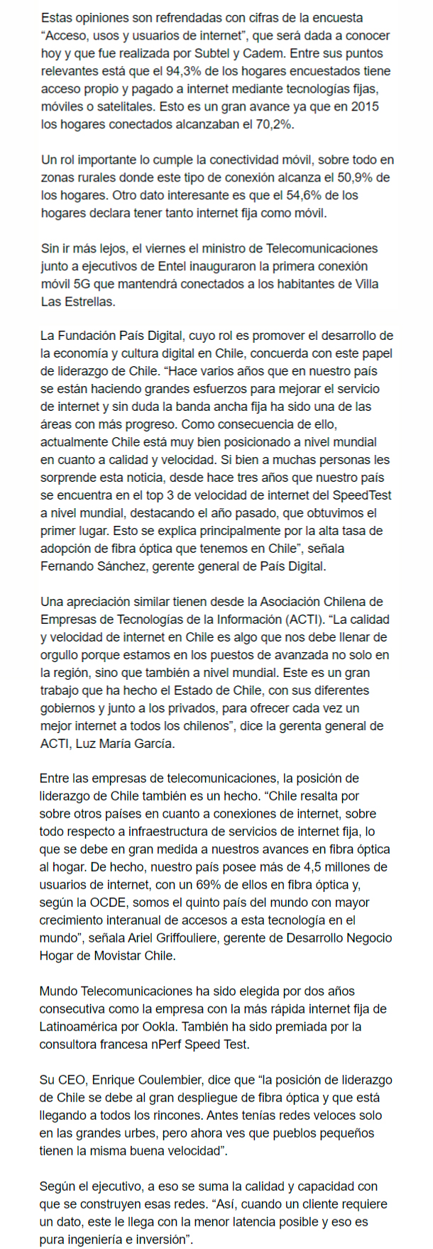 EL MERCURIO –Esto se debe a una política de Estado consistente y una inversión en fibra óptica que cada vez llega a más rincones