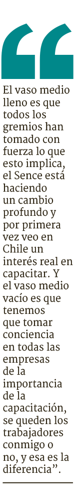 -El vaso medio lleno es que todos los gremios han tomado con fuerza lo que esto implica, el Sence está haciendo un cambio profundo, por primera vez veo en Chile un interés real en capacitar. Y el vaso medio vacío es que tenemos que tomar conciencia en todas las empresas de la importancia de la capacitación, estén conmigo o no, y esa es la diferencia. Si pienso que voy a capacitar a alguien y termina trabajando en otra fuente laboral, lo veo como un costo y no como inversión. Las empresas deben tomar hoy el rol de capacitar permanentemente, la que debe ser entregada desde las empresas, en asociación con las universidades, los institutos, pero hoy no ocurre.
