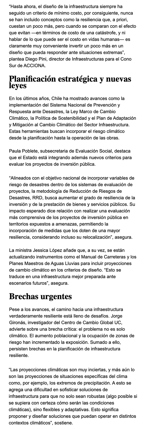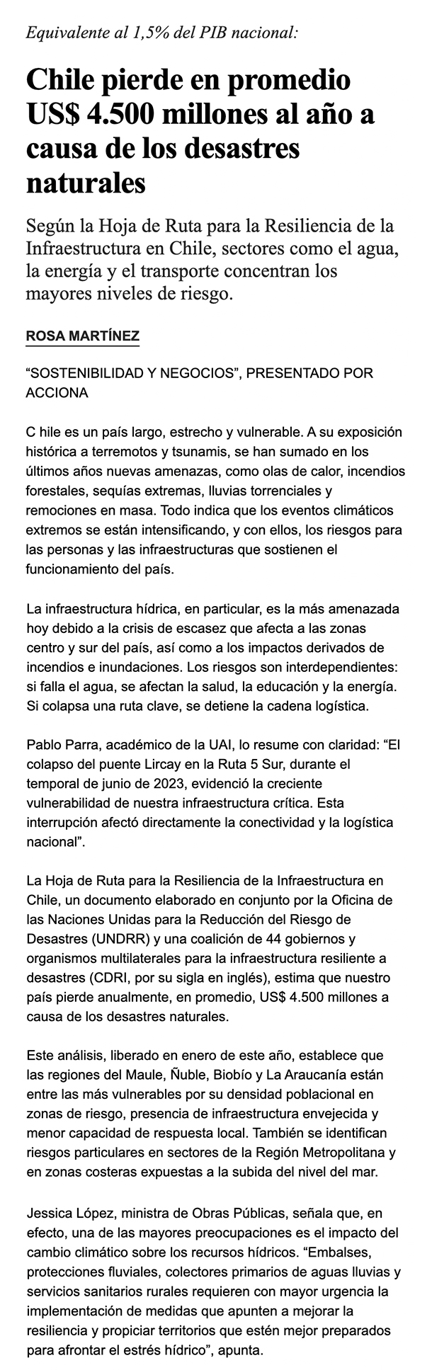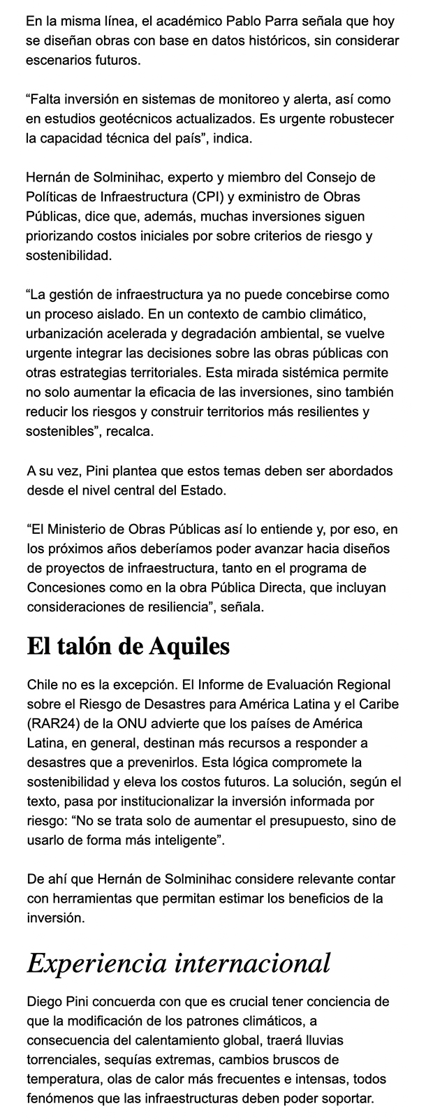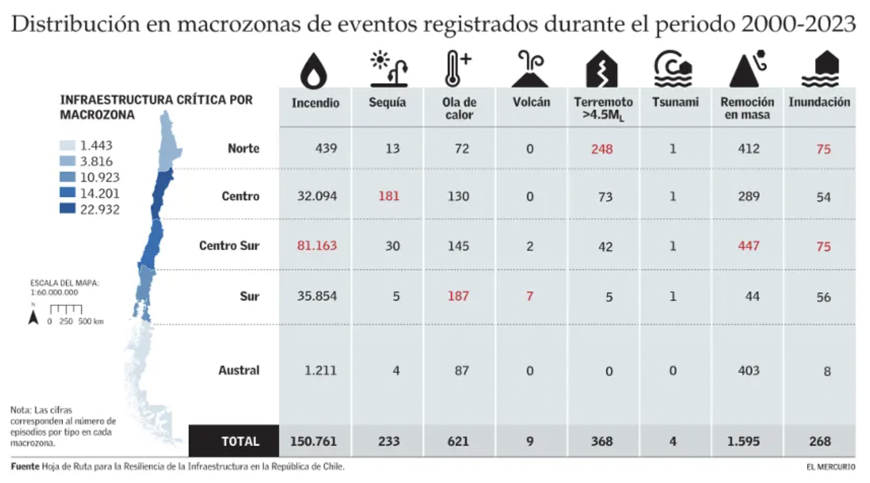 EL MERCURIO – Según la Hoja de Ruta para la Resiliencia de la Infraestructura en Chile, sectores como el agua, la energía y el transporte concentran los mayores niveles de riesgo.
