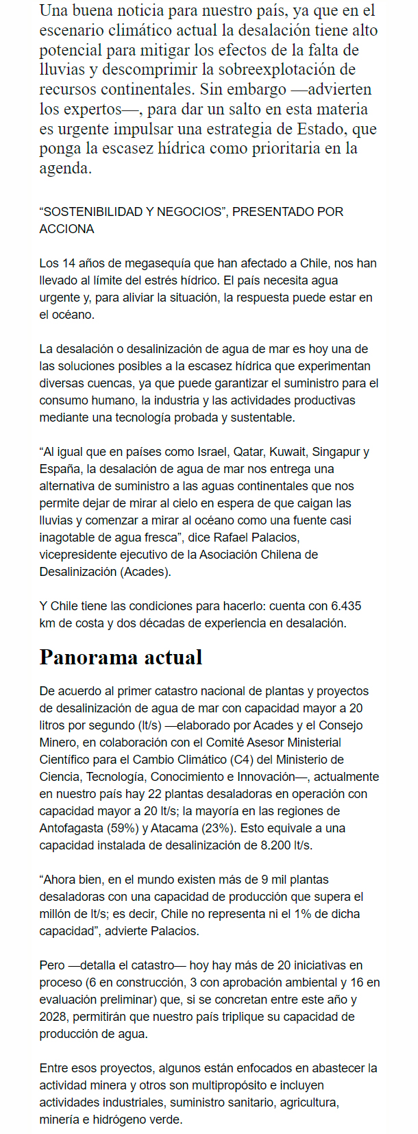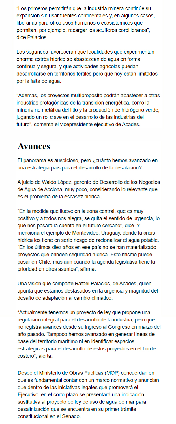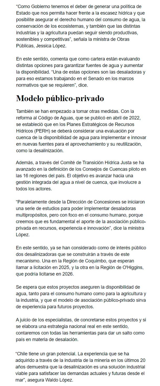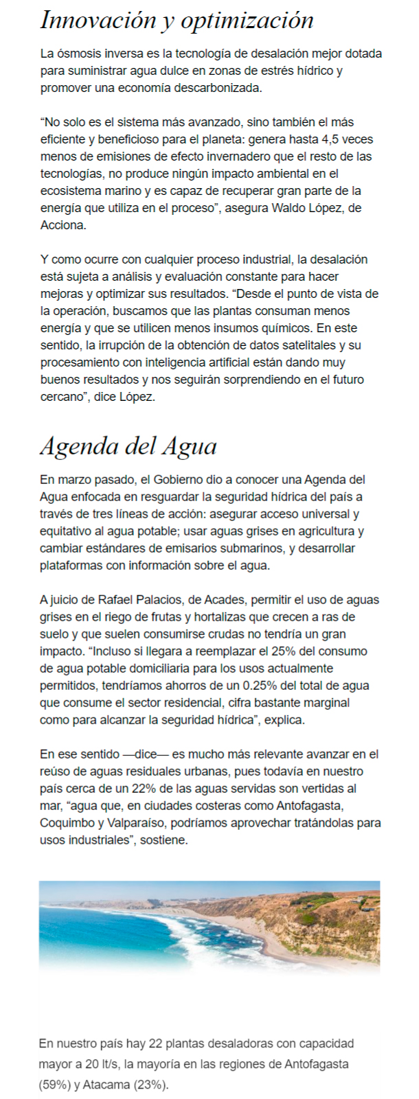EL MERCURIO – Una buena noticia, ya que en el escenario climático actual la desalación tiene alto potencial para mitigar los efectos de la falta de lluvias.