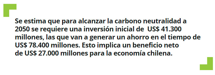 Todas estas medidas se calcularon en términos de costo-beneficio incluyendo todos los sectores -energía, forestal y otros-, lo que determinó que el costo de alcanzar la carbono neutralidad al año 2050 requiere de una inversión inicial de US$ 41.300 millones, las que van a generar un ahorro en el tiempo de US$ 78.400 millones.