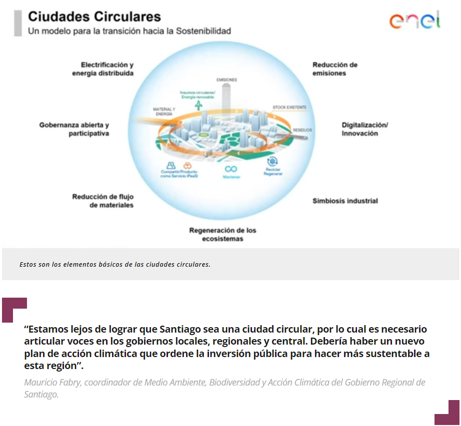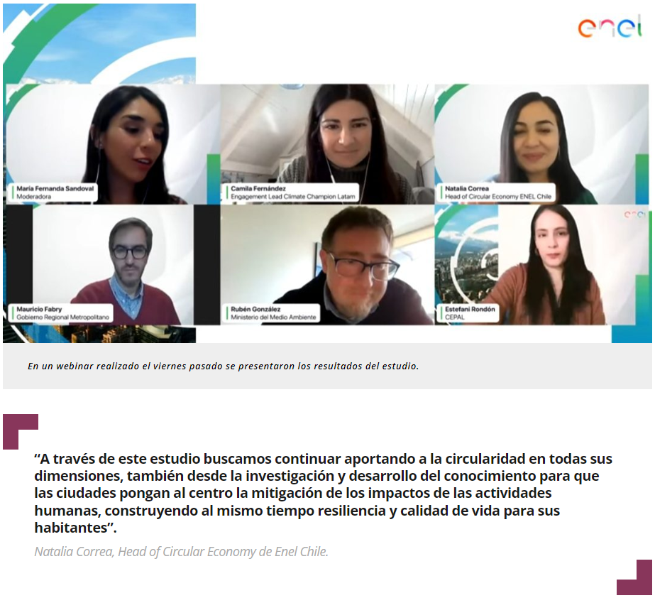 PAÍS CIRCULAR – En un seminario virtual se presentaron los principales resultados del estudio “Ciudades circulares para Chile, una visión más allá de la descarbonización”, elaborado por Enel Chile en conjunto con el Life Sciences Innovation Center de UC Davis Chile, y que cuenta con la colaboración y el patrocinio del Ministerio del Medio Ambiente. La investigación se centró en un diagnóstico y propuestas hacia la transición circular de ciudades como Santiago, Antofagasta y Concepción.