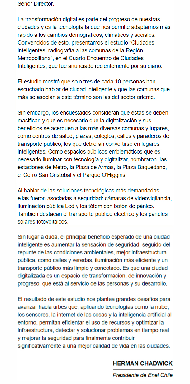 EL MERCURIO – Solo tres de cada 10 personas han escuchado hablar de ciudad inteligente y que las comunas que más se asocian a este término son las del sector oriente.