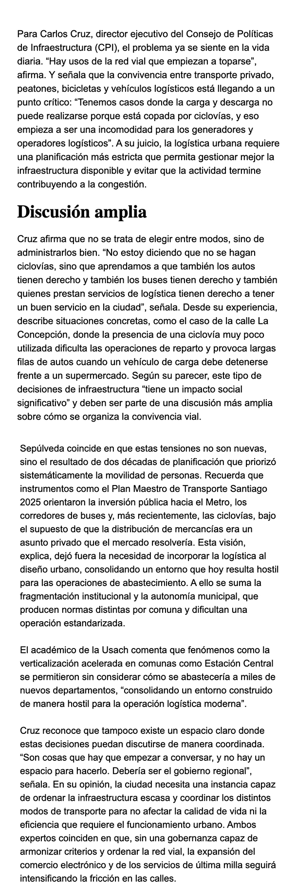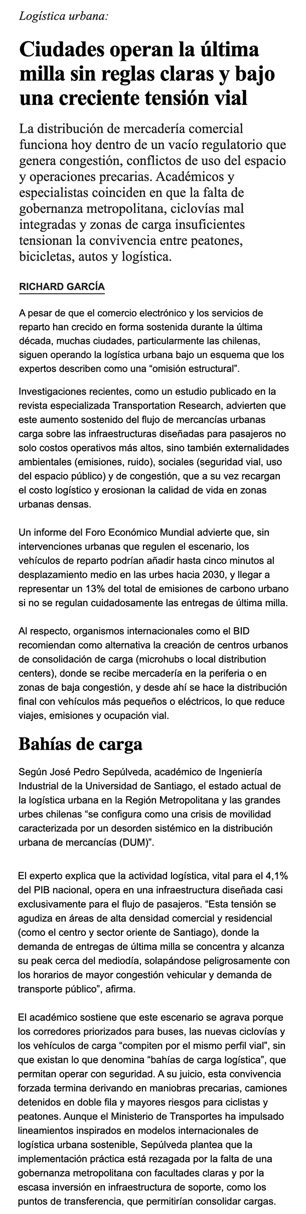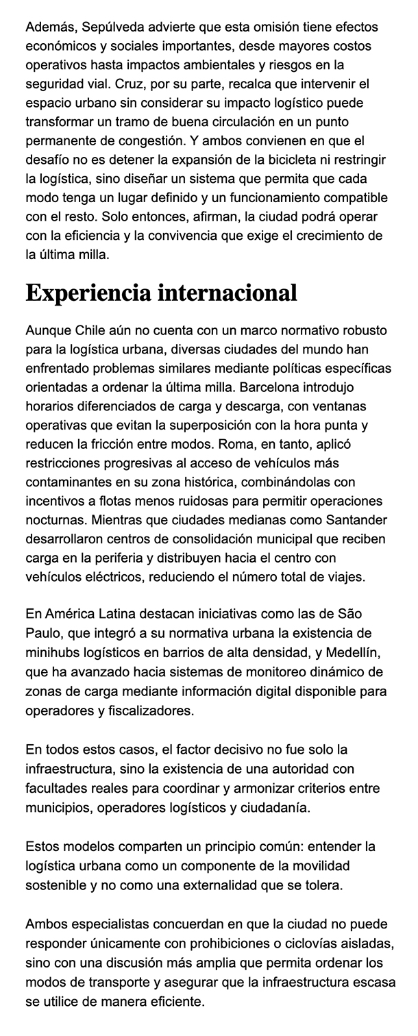 EL MERCURIO LOGÍSTICA – La distribución de mercadería comercial funciona hoy dentro de un vacío regulatorio que genera congestión, conflictos de uso del espacio y operaciones precarias. Académicos y especialistas coinciden en que la falta de gobernanza metropolitana, ciclovías mal integradas y zonas de carga insufiencintes tensionan la convivencia entre peatones, bicicletas, autos y logística.