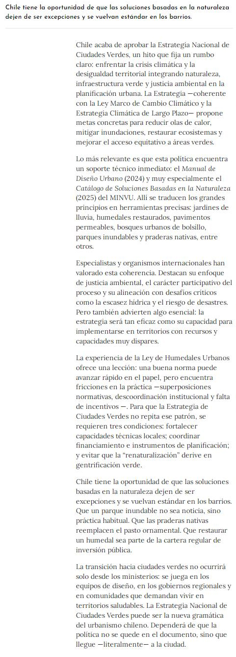 EL MOSTRADOR – Chile tiene la oportunidad de que las soluciones basadas en la naturaleza dejen de ser excepciones y se vuelvan estándar en los barrios.