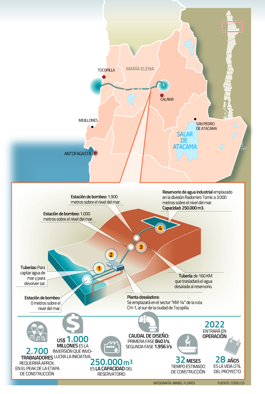 - Codelco adjudica licitación del proyecto al consorcio MTT liderado por Marubeni Corporation (50%) y conformado, además, por Transelec (30%) y Techint Chile (20%). Se espera que comience la construcción el primer trimestre de 2020 y que la planta esté operativa en 2022.