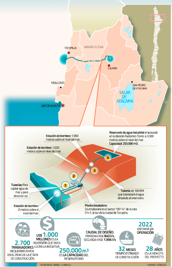Respecto a la evolución de esta iniciativa, el ministro de Minería, Baldo Prokurica, reconoció que “Codelco tomó la decisión de retomar y no desahuciar definitivamente el proyecto de desaladora”. Según explicó, entre algunas de las razones, porque a pesar que habían conversado con algunas empresas el arriendo de agua, la megasequía era un problema relevante que, además, no le permite soportar los poco más de dos años que demoraría una nueva licitación.