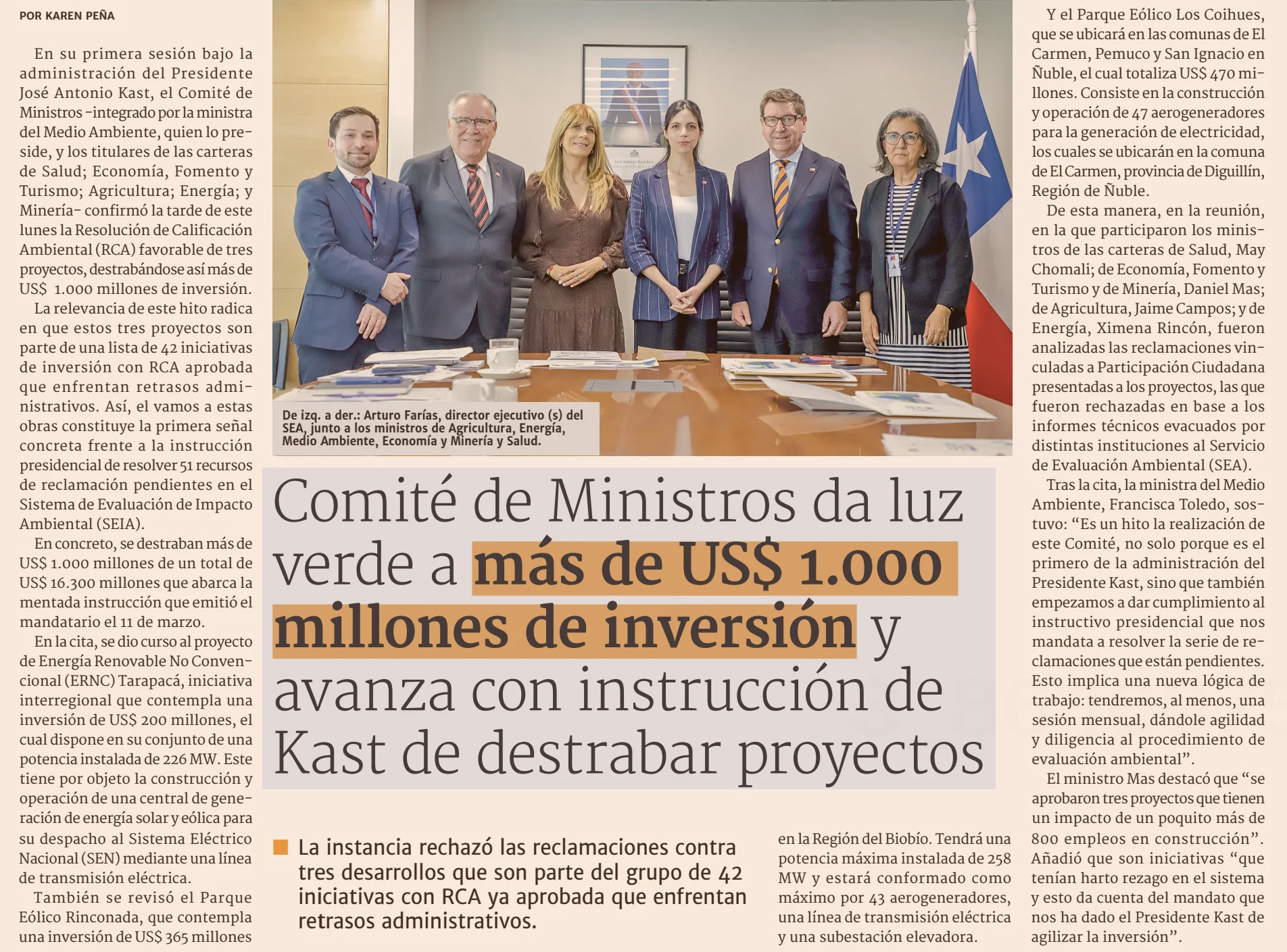Comité de Ministros da luz verde a más de US$ 1.000 millones de inversión y avanza con instrucción de Kast de destrabar proyectos
