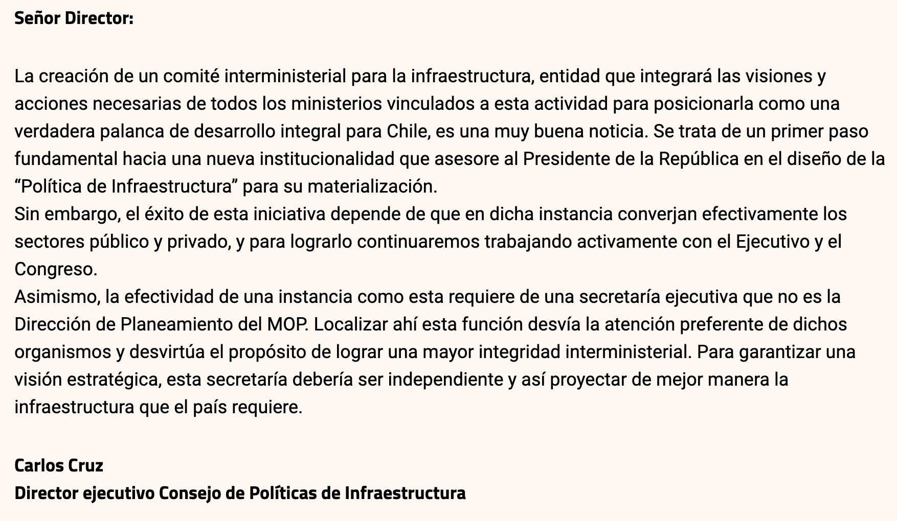 DIARIO FINANCIERO – La creación de un comité interministerial para la infraestructura, entidad que integrará las visiones y acciones necesarias de todos los ministerios vinculados a esta actividad para posicionarla como una verdadera palanca de desarrollo integral para Chile, es una muy buena noticia