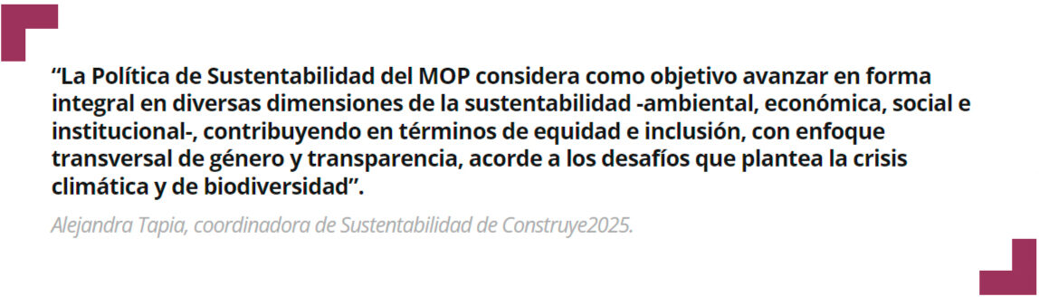 “El Estado actualmente avanza en distintos frentes”, explica la coordinadora de Sustentabilidad de Construye2025 y, en cuanto a políticas públicas, destaca al menos dos materias en desarrollo: la actualización de la Estrategia Nacional de Construcción Sustentable, inserta en un convenio interministerial y liderada por el Ministerio de Vivienda y Urbanismo (Minvu), y la actualización de la Política de Sustentabilidad del MOP. “Esta última iniciativa considera como objetivo avanzar en forma integral en diversas dimensiones de la sustentabilidad -ambiental, económica, social e institucional-, contribuyendo en términos de equidad e inclusión, con enfoque transversal de género y transparencia, acorde a los desafíos que plantea la crisis climática y de biodiversidad”.