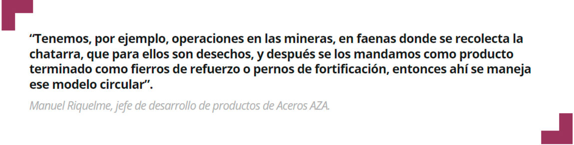 En concordancia con lo dicho por Alejandra Tapia, Riquelme pone énfasis en que Aceros AZA posee un modelo de economía circular efectivo, tanto en el negocio de producción de acero a partir de chatarra ferrosa, como a través de su filial EcoAZA, que revaloriza los residuos de aquel proceso para diversos usos. “Cuando vendemos fierro también nos preocupamos de comprar chatarra, tanto así que hoy día tenemos, por ejemplo, operaciones en las mineras -entre ellas El Teniente, de Codelco- , en faenas donde se recolecta la chatarra, que para ellos son desechos, y después se los mandamos como producto terminado como fierros de refuerzo o pernos de fortificación, entonces ahí se maneja ese modelo circular”.