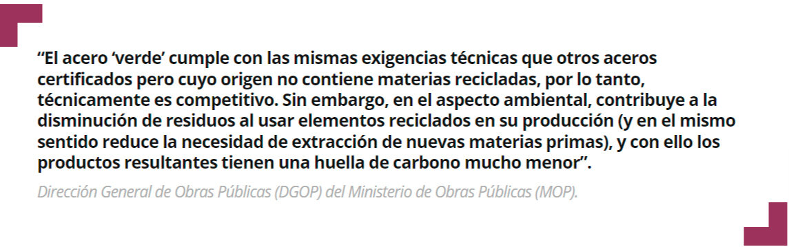 Respecto al uso del acero reciclado, desde la Dirección General de Obras Públicas (DGOP) del Ministerio de Obras Públicas (MOP), que dirige el ingeniero civil constructor Boris Olguín Morales, comentan a País Circular que “el acero ‘verde’ cumple con las mismas exigencias técnicas que otros aceros certificados pero cuyo origen no contiene materias recicladas, por lo tanto, técnicamente es competitivo. Sin embargo, en el aspecto ambiental, contribuye a la disminución de residuos al usar elementos reciclados en su producción (y en el mismo sentido reduce la necesidad de extracción de nuevas materias primas), y con ello los productos resultantes tienen una huella de carbono mucho menor”.