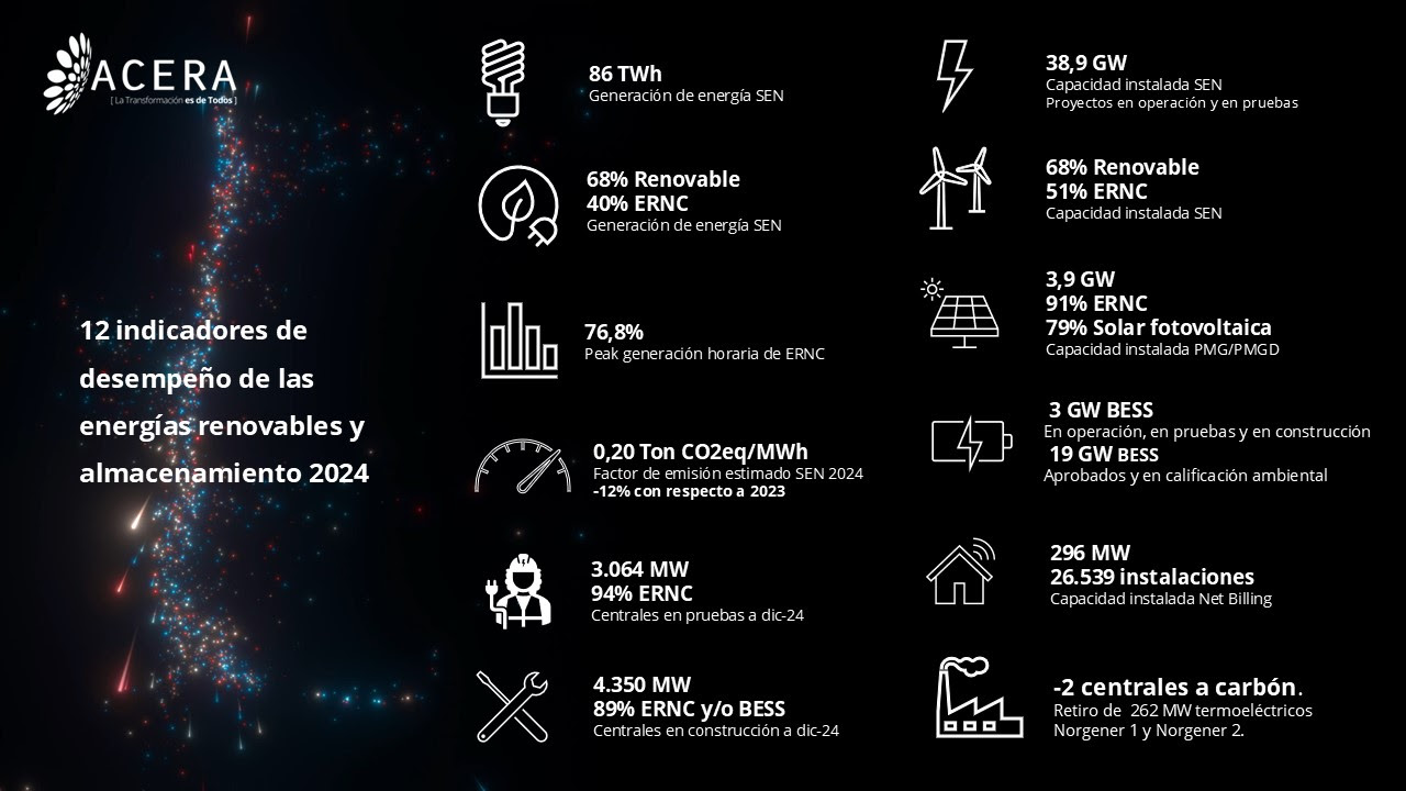 TIEMPO 21 – La Asociación Chilena de Energías Renovables y Almacenamiento (ACERA A.G.) presentó su balance anual del sector energético correspondiente a 2024 durante la Conferencia Anual de Energías Renovables y Almacenamiento, titulada «Panorama Renovable». El evento, realizado en colaboración con Huawei, resaltó los importantes logros del año en energías limpias y almacenamiento, así como los desafíos que enfrenta el país para consolidar su transición energética.