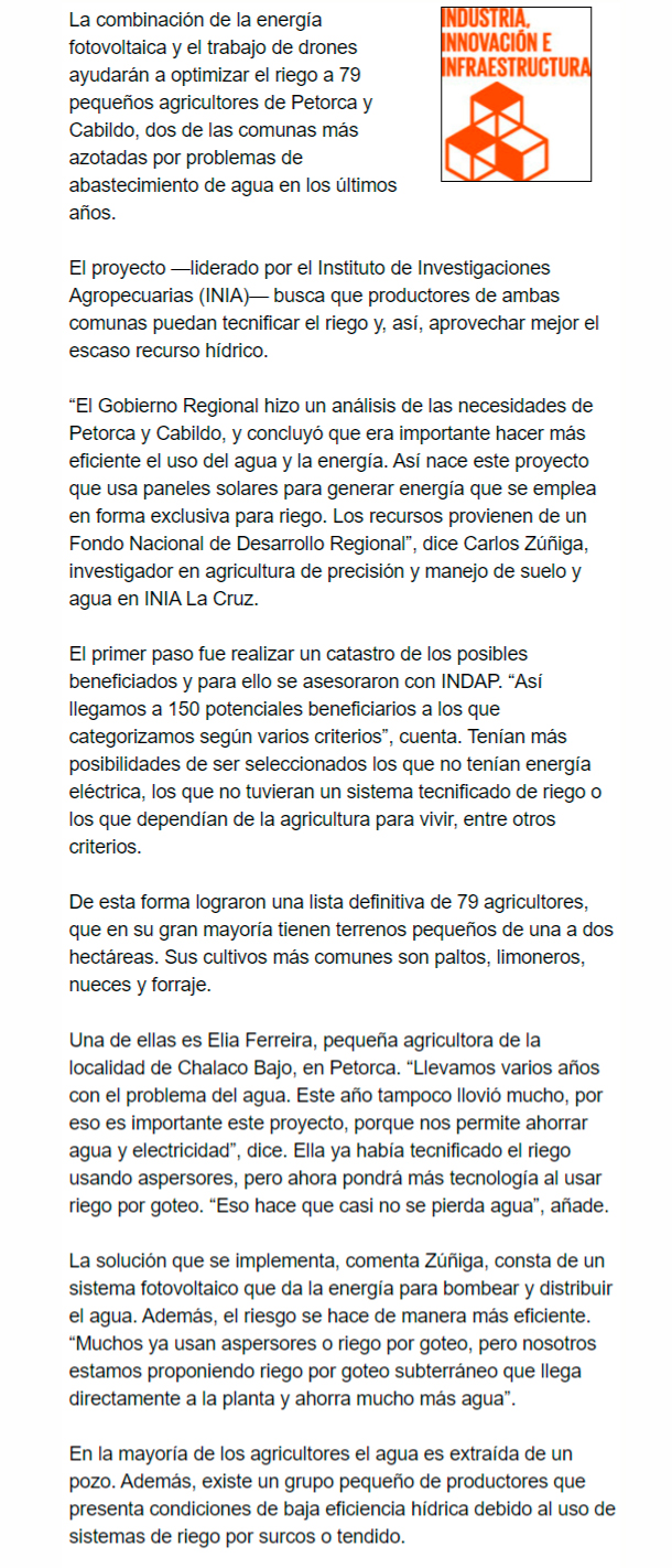 EL MERCURIO – En dos de las comunas más afectadas por la sequía en el país, un proyecto está usando paneles solares para conseguir riego tecnificado y más eficiente.