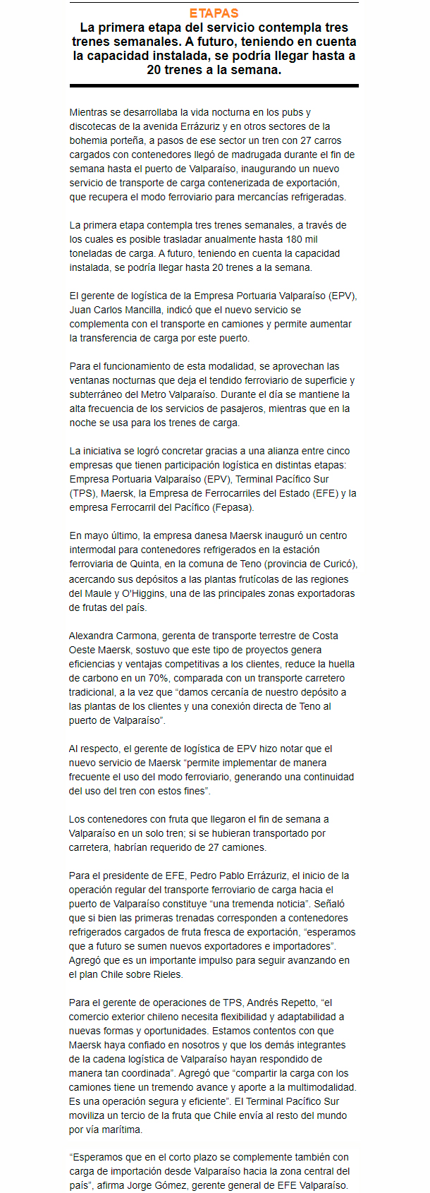 EL MERCURIO – Modalidad se concretó tras una alianza de cinco empresas que participan en distintas etapas logísticas para aumentar la transferencia de mercancías refrigeradas.