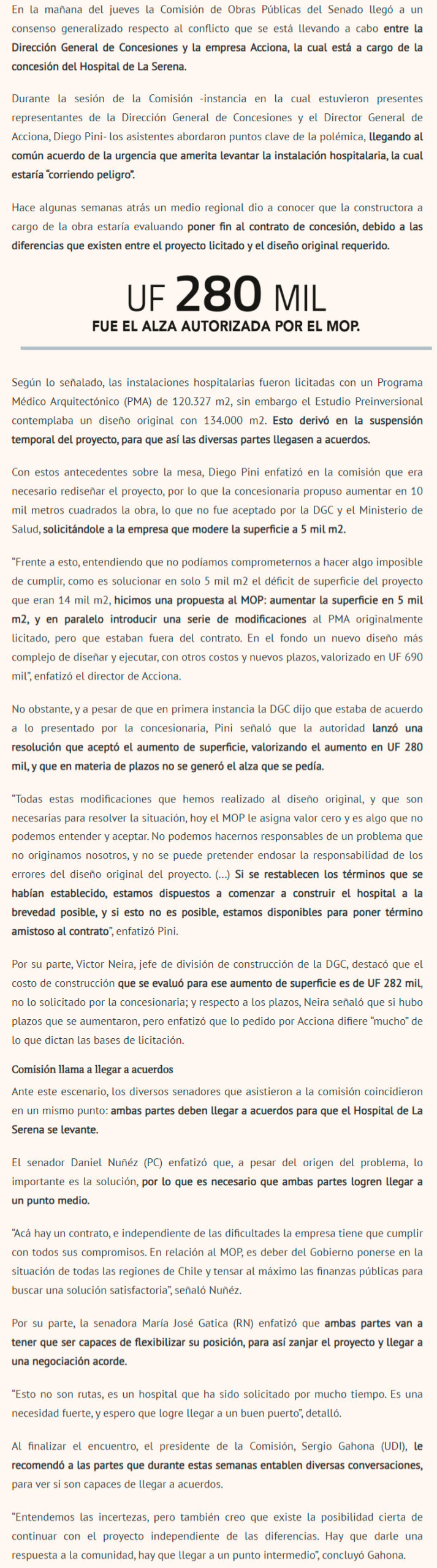 DIARIO FINANCIERO – Comisión de Obras Públicas del Senado pide “flexibilización” a las partes, para que logren llegar a acuerdos