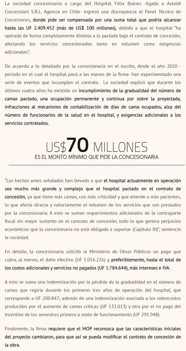 DIARIO FINANCIERO – Sociedad detalló que el recinto actualmente en operación es mucho más grande y complejo que el pactado en el contrato de concesión, ya que tiene más camas, con más criticidad y atiende a más pacientes.
