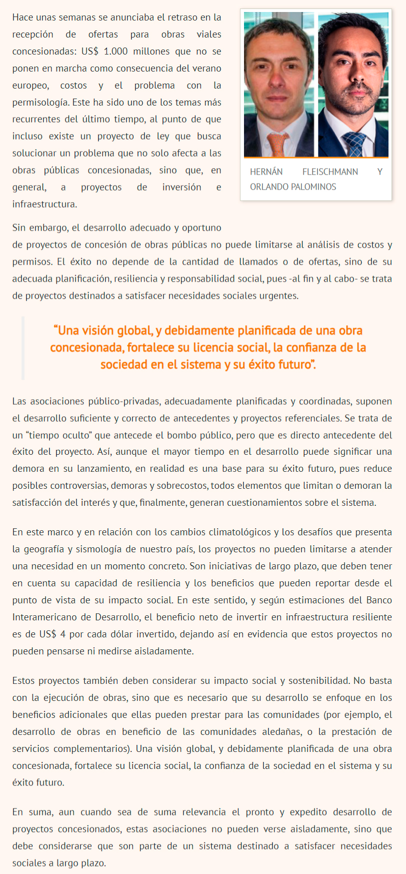 DIARIO FINANCIERO – Una visión global, y debidamente planificada de una obra concesionada, fortalece su licencia social, la confianza de la sociedad en el sistema y su éxito futuro