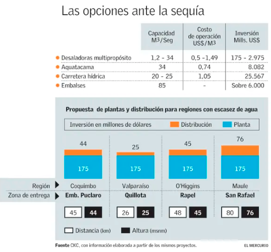 El estudio señala que la única alternativa que puede hacerlo es una red de plantas desaladoras de agua de mar, distribuidas en la larga costa chilena. A diferencia de las que ya se han instalado en Chile y que sirven principalmente a proyectos mineros, “la estrategia para enfrentar la sequía debe estar en plantas desaladoras multipropósito; esto es, que se diseñen para servir la necesidad de agua para el consumo, la agricultura y la minería”, dice José Antonio Ramírez, académico de la U. Católica y gerente general de CKC.