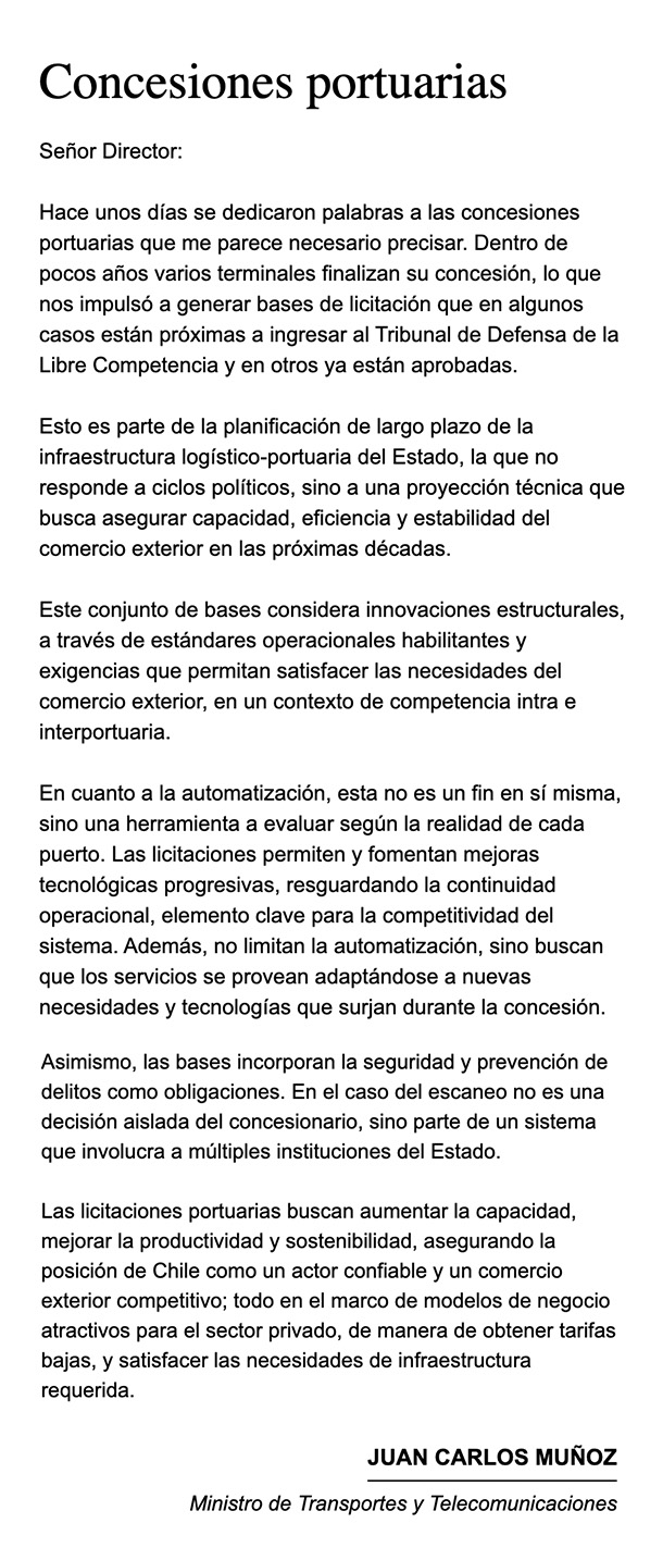 Concesiones portuarias, carta al director de Juan Carlos Muñoz