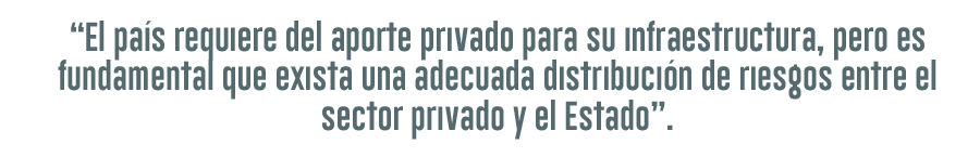 El país requiere del aporte privado en el desarrollo de su infraestructura, pero es fundamental que exista una adecuada distribución de riesgos entre el sector privado y el Estado. Volver atrás a un sistema en que los riesgos y pérdidas son públicas, pero las rentas son privadas, es un despropósito, especialmente en momentos que el país enfrenta enormes desafíos de restitución de las confianzas en la actividad empresarial y el rol regulador del Estado.