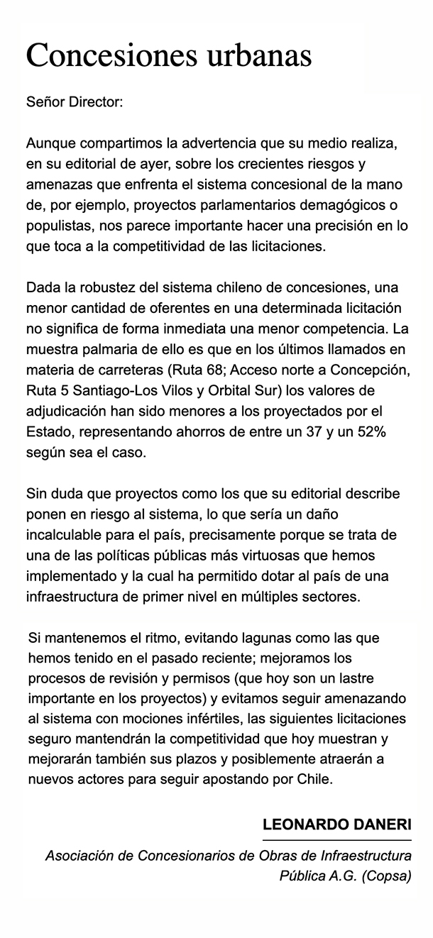 EL MERCURIO – Dada la robustez del sistema chileno en concesiones, una menor cantidad de oferentes en una determinada licitación no significa de forma inmediata una menor competencia