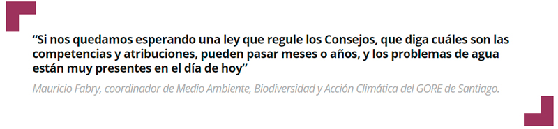 En tanto, desde el GORE, Fabry explica que asumieron este desafío ahora porque “si nos quedamos esperando una ley que regule los Consejos, que diga cuáles son las competencias y atribuciones, pueden pasar meses o años, y los problemas de agua están muy presentes en el día de hoy. Tenemos que responder cuanto antes a la crisis hídrica que es por lejos el principal desafío ambiental que tiene la región Metropolitana”.