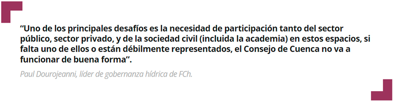 Consultado sobre otros retos al momento de crear estas instancias deliberantes a nivel de cuenca, el profesional de FCh destaca “la necesidad de participación tanto del sector público, sector privado, y de la sociedad civil (incluida la academia) en estos espacios; si falta uno de ellos o están débilmente representados, el Consejo de Cuenca no va a funcionar de buena forma, porque necesariamente se tienen que coordinar esos sectores”. Se necesita, agrega, el compromiso de todos con un objetivo común: la seguridad hídrica. Esto, dice “es difícil de resolver cuando tiene un carácter voluntario”.