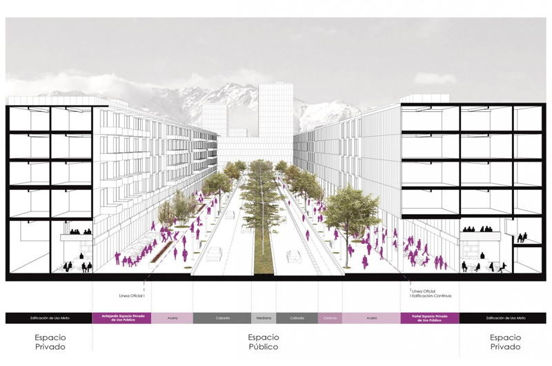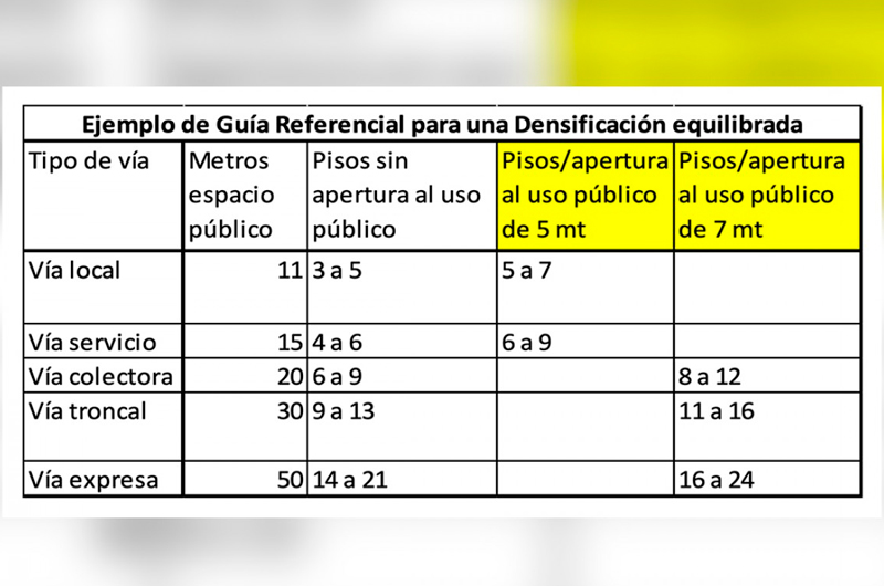El documento establece una proporción de 1 a 1 o 1 a 1,5 entre la altura de una edificación y el espacio público, entiéndase, calle, vereda, ciclovías, etc. Pero además propone incentivos normativos que posibiliten la apertura y ampliación de espacios públicos los que en la actualidad son difíciles de encontrar y generar. Es decir, si la edificación abre espacios de uso público puede aumentar su elevación.