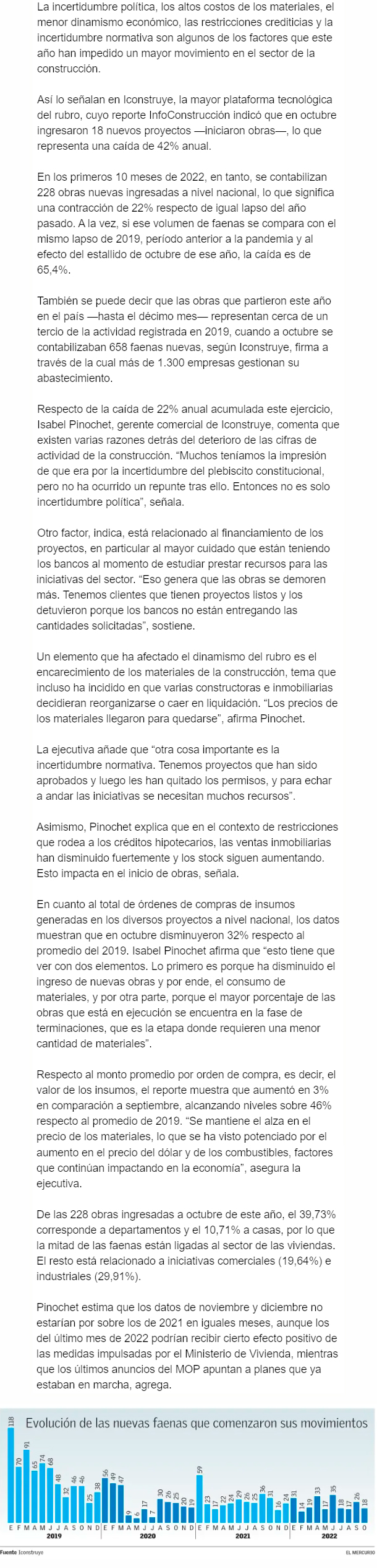 EL MERCURIO – Los proyectos que partieron en 2022 distan de los 658 detectados en los 10 primeros meses de 2019.