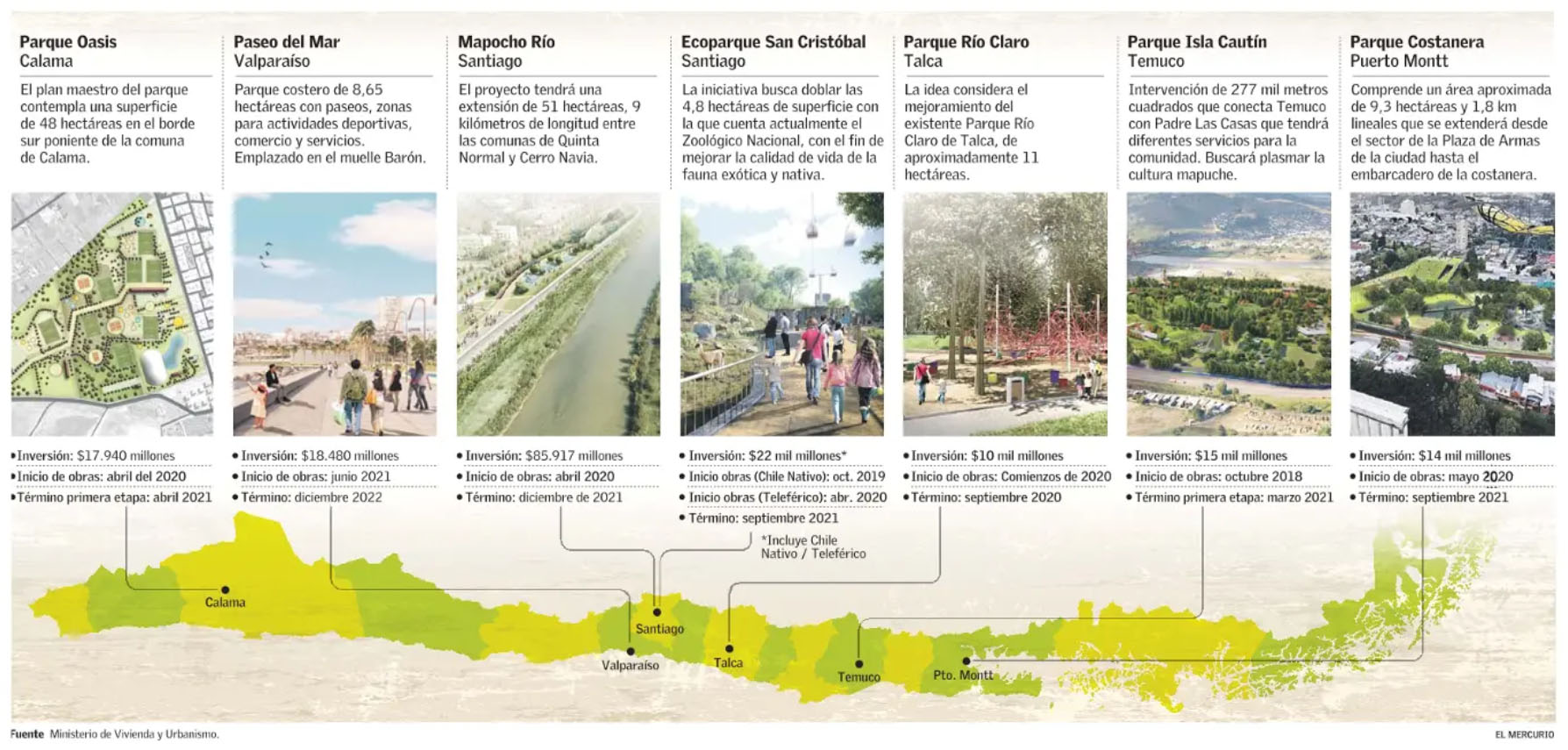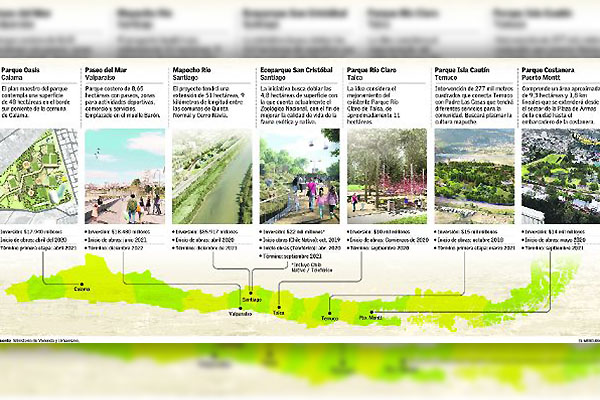 Y ya hay proyectos avanzando: en Calama se construirá el parque gigante Oasis; en Valparaíso, el Paseo del Mar en el Muelle Barón; en Santiago, el Mapocho Río en el sector poniente de la capital; en Talca, el parque Río Claro; en Temuco, el Isla Cautín; en Puerto Montt, el parque Costanera; y en Magallanes, la costanera del estrecho.