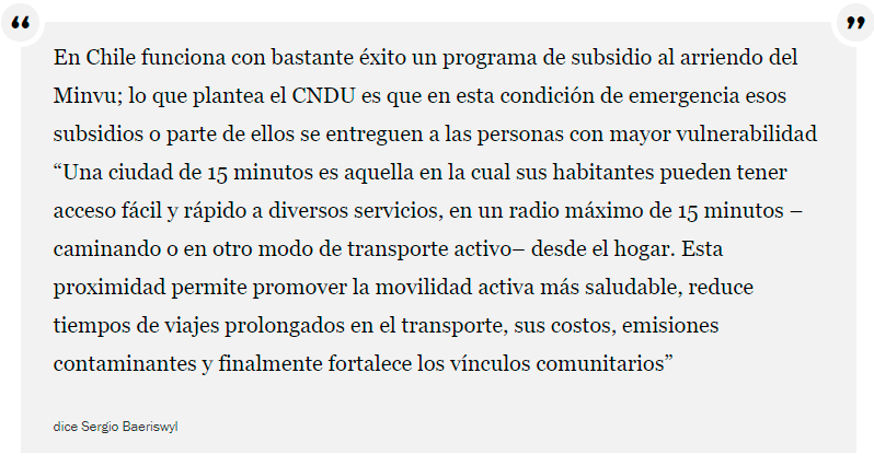 En Chile funciona con bastante éxito un programa de subsidio al arriendo del Minvu; lo que plantea el CNDU es que en esta condición de emergencia esos subsidios o parte de ellos se entreguen a las personas con mayor vulnerabilidad durante los próximos cuatro o cinco meses. “Hoy en Chile se entregan más o menos 60 mil subsidios al año a través del ministerio. Para que el déficit se reduzca al 50% al año 2025 se deberían subsidiar alrededor de 90 mil. Ese es el gran desafío de la agenda social urbana que planteó el CNDU”, dice Baeriswyl.