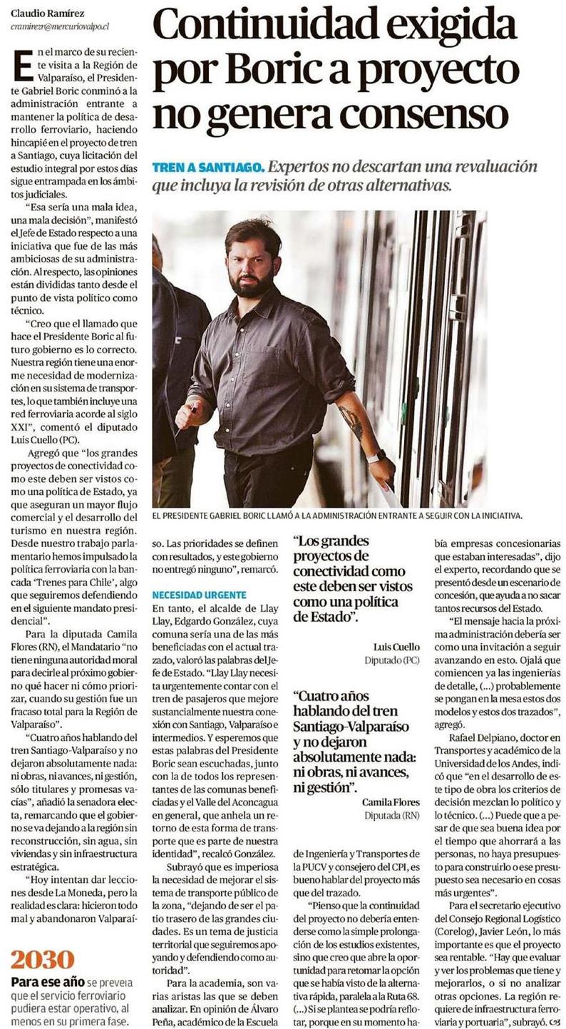 EL MERCURIO DE VALPARAÍSO – Tren a Santiago. Expertos no descartan una revaluación que incluya la revisión de otras alternativas.