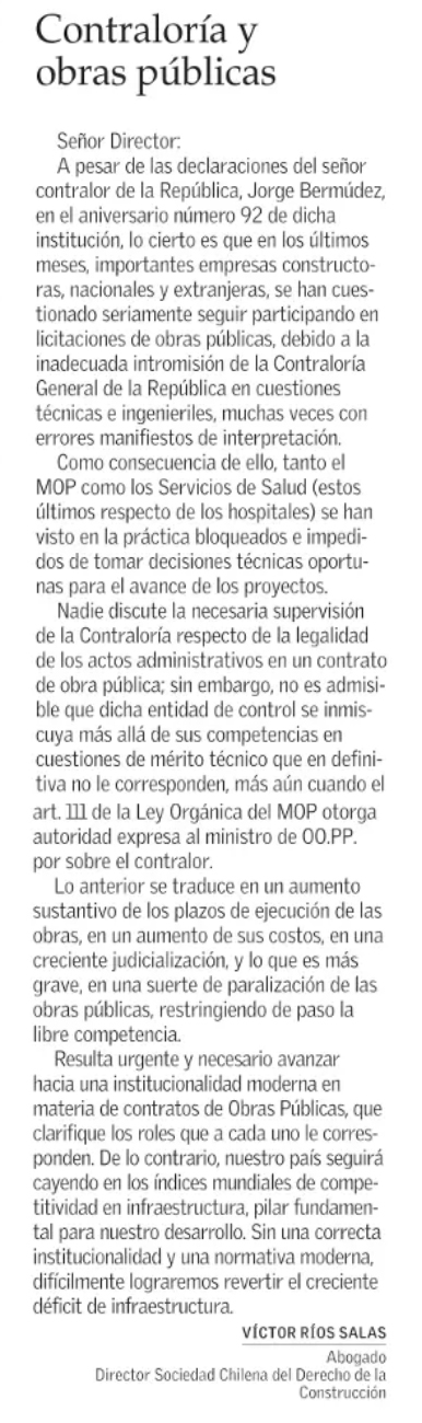 EL MERCURIO – A pesar de las declaraciones del señor contralor de la República, Jorge Bermúdez, en el aniversario número 92 de dicha institución, lo cierto es que en los últimos meses, importantes empresas constructoras, nacionales y extranjeras, se han cuestionado seriamente seguir participando en licitaciones de obras públicas, debido a la inadecuada intromisión de la Contraloría General de la República en cuestiones técnicas e ingenieriles, muchas veces con errores manifiestos de interpretación.