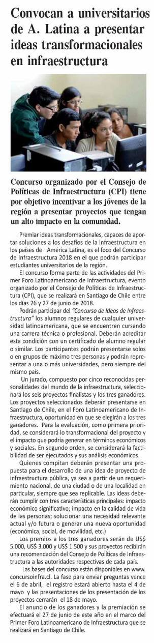 El concurso forma parte de las actividades del Primer Foro Latinoamericano de Infraestructura, evento organizado por el Consejo de Políticas de Infraestructura (CPI), que se realizará en Santiago de Chile entre los días 26 y 27 de junio de 2018.