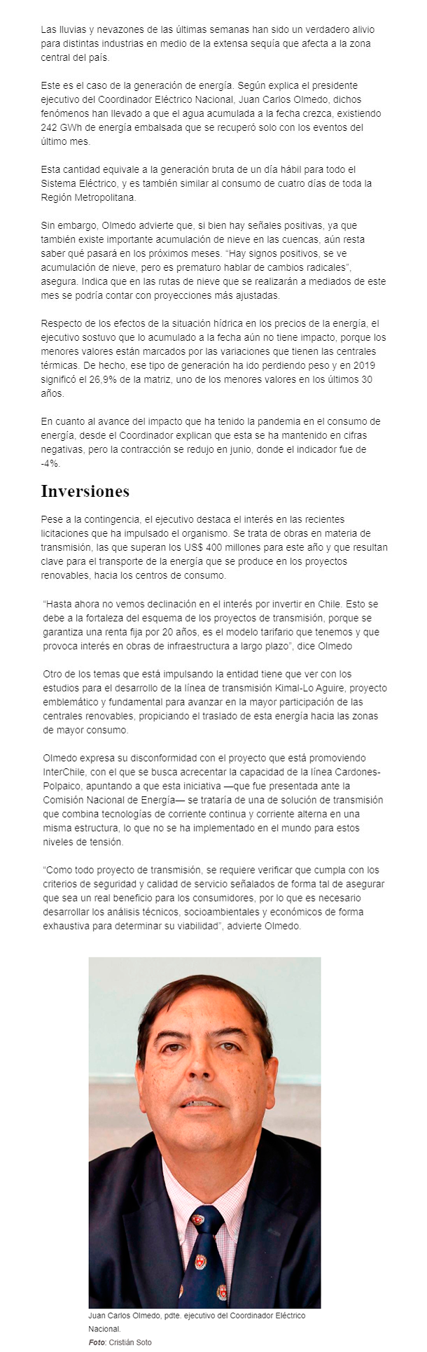 EL MERCURIO – Con las precipitaciones del último mes se acumuló energía en embalses equivalente al consumo de cuatro días de la capital
