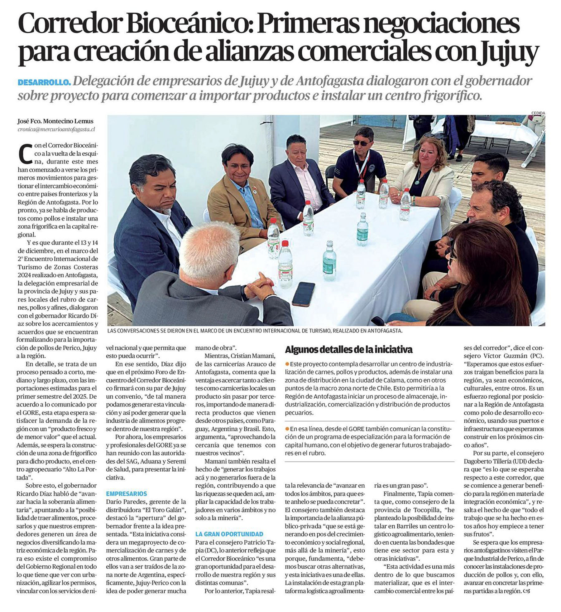 EL MERCURIO DE ANTOFAGASTA – Delegación de empresarios de Jujuy y de Antofagasta dialogaron con el gobernador sobre el proyecto para comenzar a importar productos e instalar un centro frigorífico.