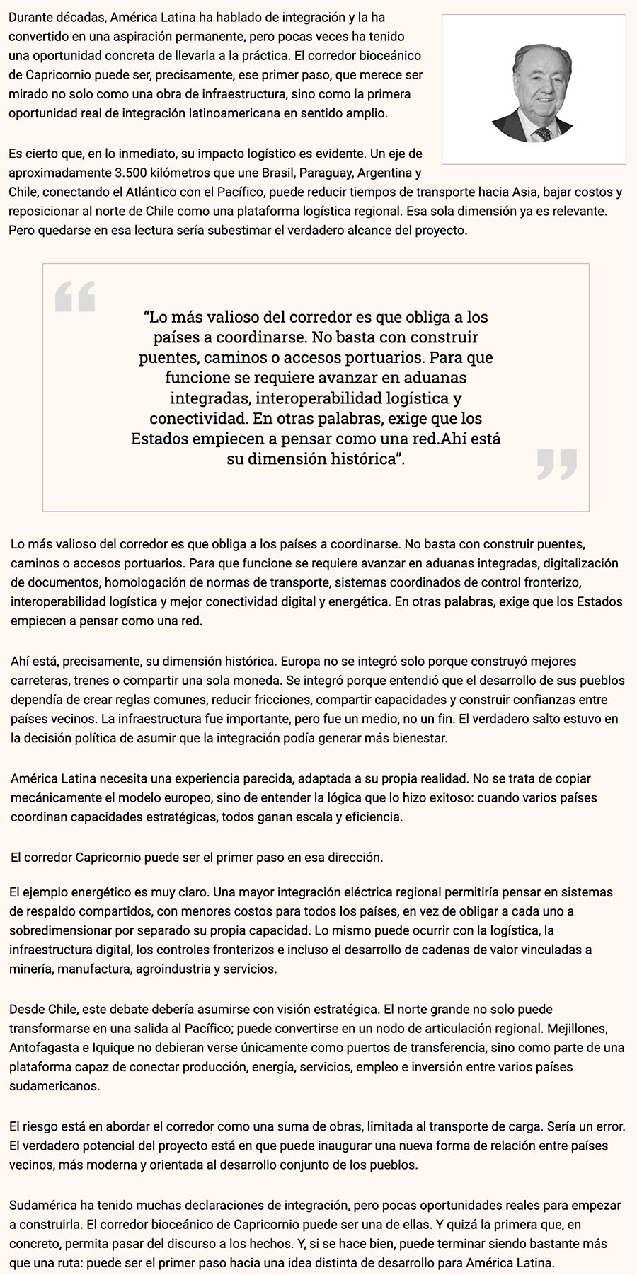 DIARIO FINANCIERO – “Lo más valioso del corredor es que obliga a los países a coordinarse. No basta con construir puentes, caminos o accesos portuarios. Para que funcione se requiere avanzar en aduanas integradas, interoperabilidad logística y conectividad”